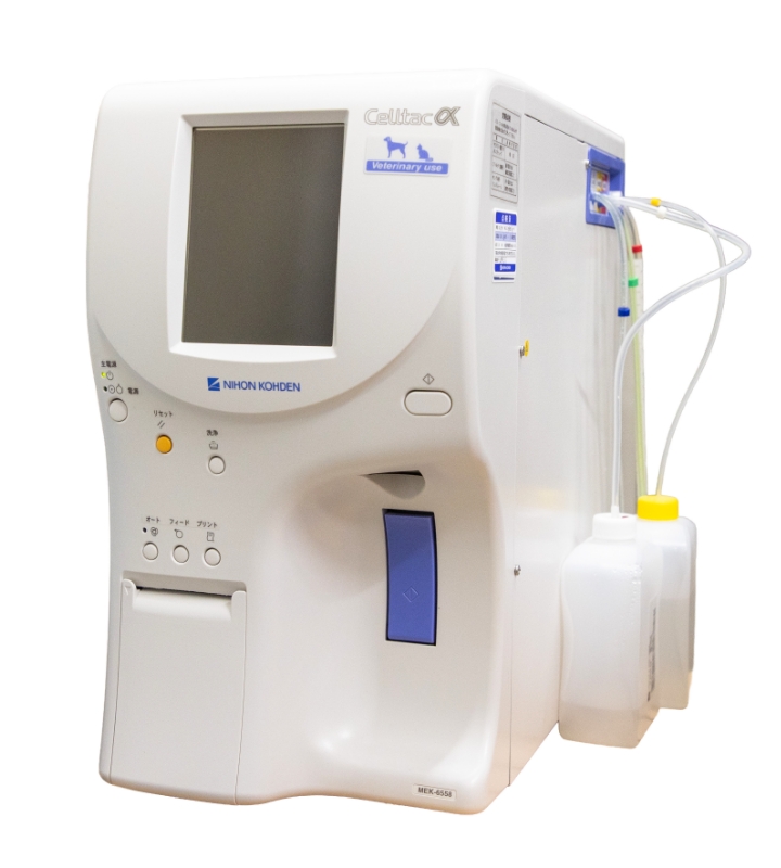 血液中の白血球、赤血球、血小板などの数を素早く測定する機械で、貧血や炎症、血液病、フィラリア症などの病気の診断や、全身状態の確認に使用します。