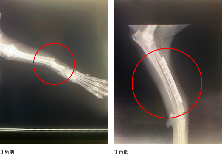 骨折は、骨が折れる、ひびが入った状態のことをいい、体のどこの骨にも起こる可能性があります。骨折すると多くの場合、非常に強い痛みを伴います。最近では、小型犬を飼っている家庭が増えており、前足の肘から下の骨である橈尺骨(とうしゃくこつ)の骨折が多くみられます。