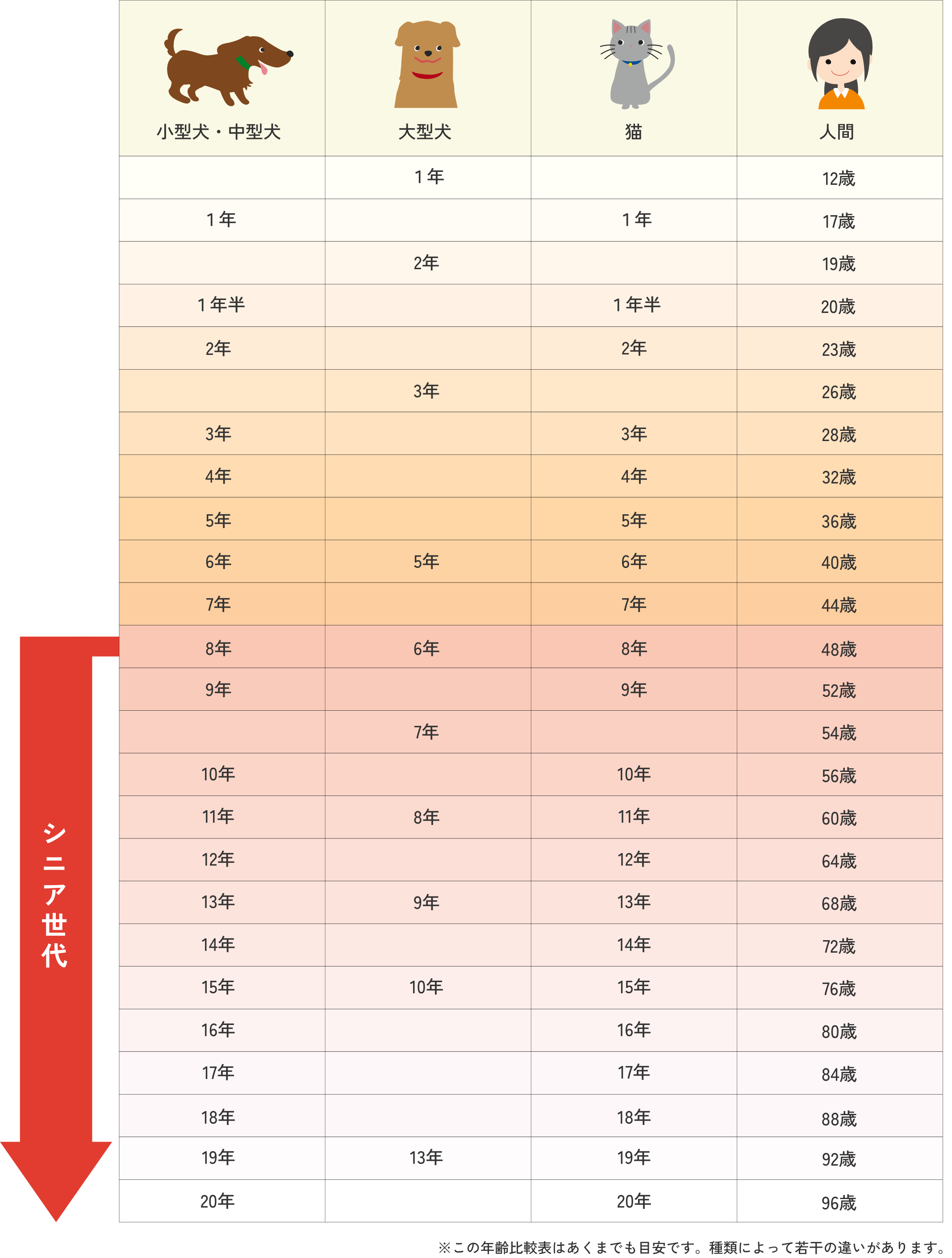 ※この年齢比較表はあくまでも目安です。種類によって若干の違いがあります。